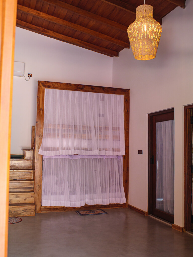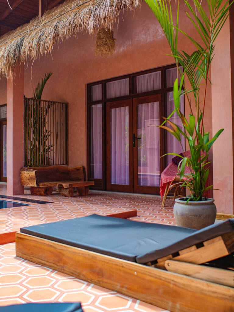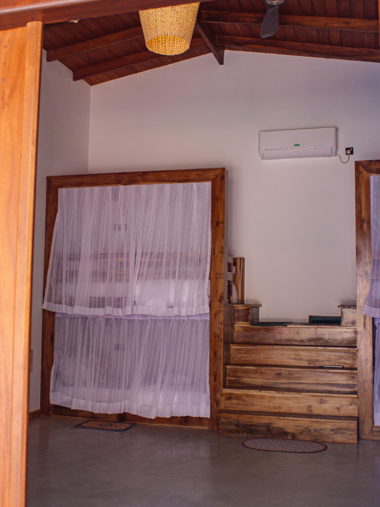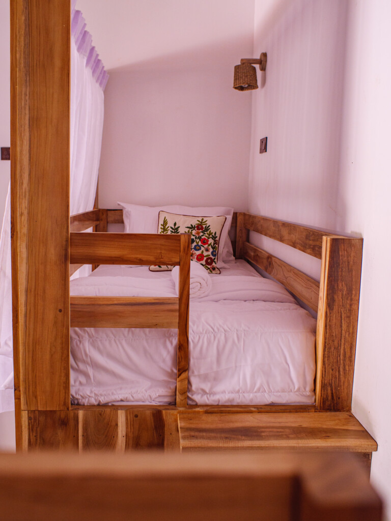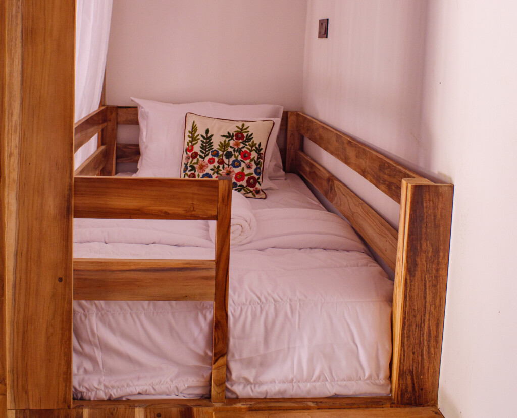 Our cozy dorm room is simple and clean with air conditioning, and storage space for your belongings. This room has a shared bathroom accessible in the room. Towels are provided, and the room will be cleaned every other day. Outside the dorm room is a beautiful swimming pool area for you to relax and hang out with friends after your surf sessions.